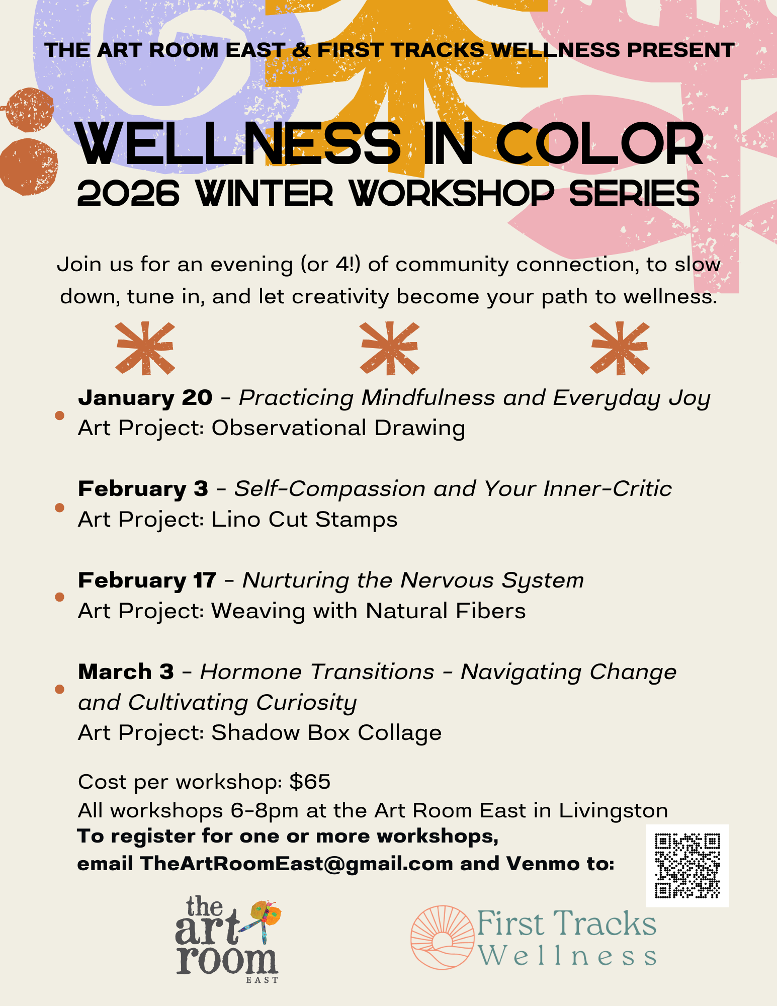 Contact Susannah Robertson at theartroomeast@gmail.com to register